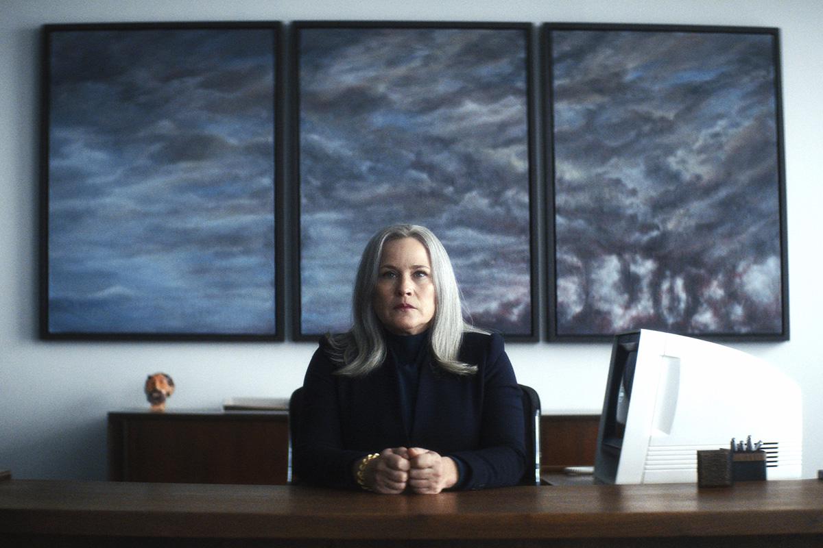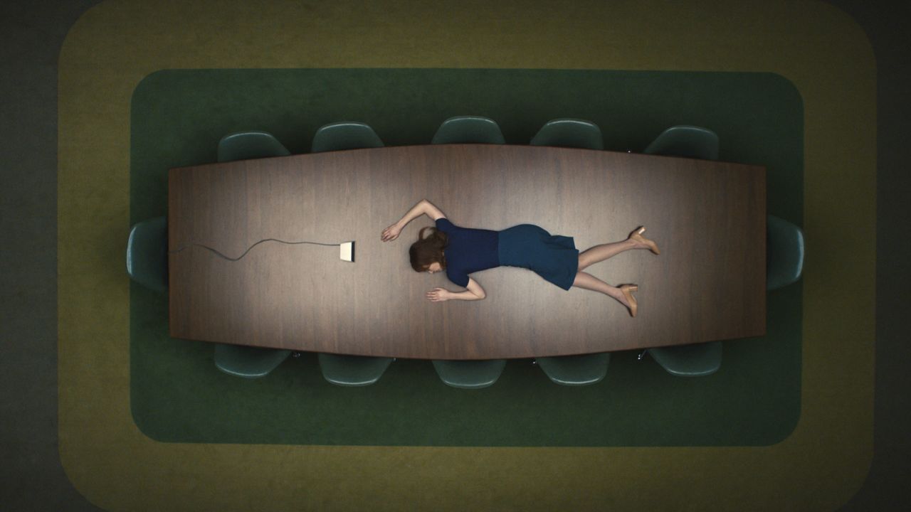 The first thing to notice is the colour palette. She is dressed in blue, but her hair is chestnut red. It spills out for the frame of her figure into the table around it, blockaded at its border by chairs and a carpet clad in green, yellow, then green again; then gray. The establishing shot is a bird's eye view of an unknown woman who is soon revealed to have been put in the board room by someone else's design, who learns about her predicament only by a man's voice that emanates from the little device that rests on the table along with the woman, arranged so that it aims directly at her head.