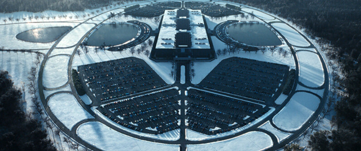 Indeed, the aura of Lumon as a futuristic computing corporation from the late 70s is reinforced by the fact that its headquarters are shot at Bell Labs in New Jersey, a building that has now been renovated as a mixed-use office for high-tech startup companies as Bell Works. Bell Labs is the quasi-mythological source in the contemporary corporate technology culture (Silicon Valley) of the idea that a certain kind of research freedom characterized by open-ended product delivery timelines and serendipitous encounters in open office plans can cultivate ground-breaking technology. (Mark Zuckerberg recommended a book on Bell Labs as one of his 'important books' of 2015.) The irony of this setting, of course, both in Severance and in the technology companies it parodies with which we are familiar in the American landscape in 2025, is that the workplace has never been more saturated with surveillance and micro-management. The overhead shot of Helly R that opened the series is indicative here again, as is the complementary overhead of MDR's desks we get in this episode: there is always something watching from above, it seems, even if what it captures of the actual activity is a flattened and at times misrepresentative image.