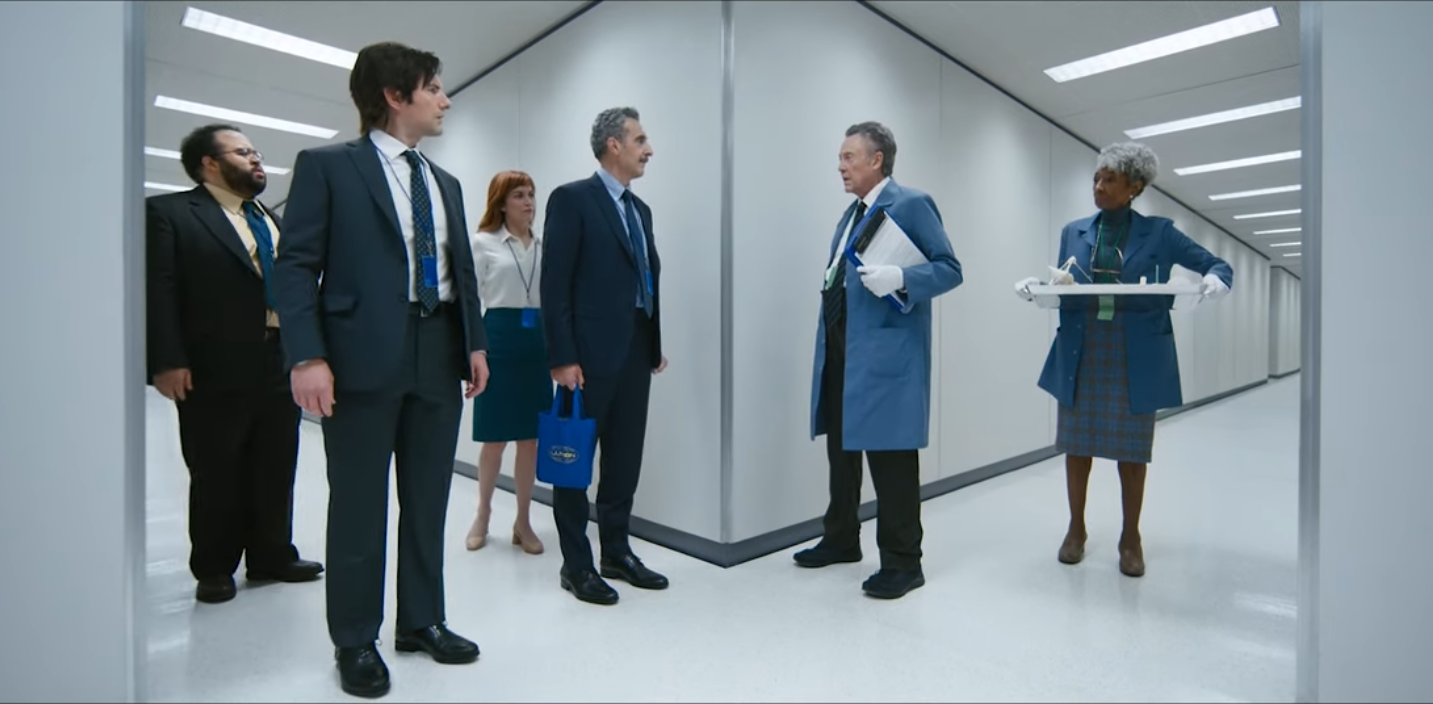 The composition of this shot puts the reflective axis down the center, and the encounter is suggestively Oedipean in its structure (at a crossroads, unknowing of the Other at play). Note that Irving is compositionally mirrored by Burt, played by Christopher Walken, and we will explore this suggestive symmetry in detail in later episodes. The two departments (MDR and O&D) know of each other, we surmise from the dialogue that follows. But Irving isn't supposed to know Burt by name, as he accidentally happened upon him in S1E2 on the way to a Wellness session. (Burt was coming from his Wellness session.)